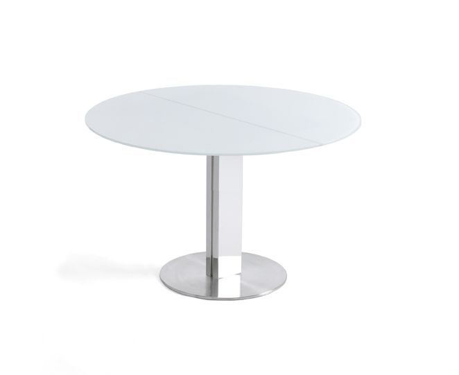 Стол обеденный раздвижной с основанием из нержавеющей стали. Столешница круглой, квадратной или прямоугольной формы выполнена из сверпрочного прозрачного стекла.