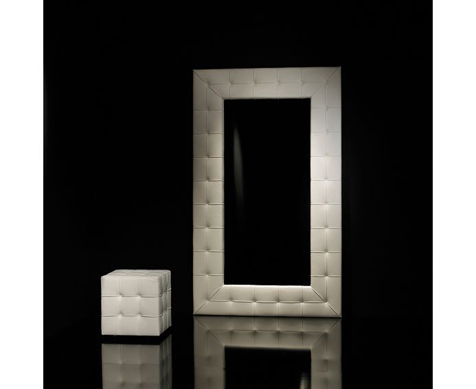 Зеркало с рамкой обитой технической тканью, мягкой или синтетической кожей в технике капитоне.