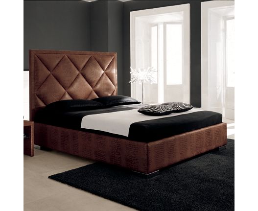 Шикарная двуспальная кровать, выполненная в современном стиле. В качестве обивки используется ткань, мягкая или синтетическая кожа, крокодиловая кожа. Высокое мягкое изголовье декорировано прострочкой, образующей ромбовидный узор. В основании кровати можно разместить контейнер для хранения вещей. Кровать стоит на коротких широких ножках.