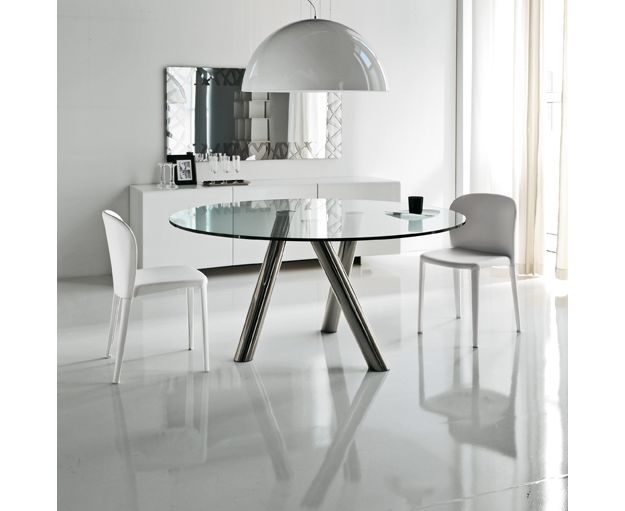 Стол с ножками из хромированной стали, черного хрома или обитыми кожей. Столешница сделана из прозрачного закаленного стекла толщиной 15 мм.