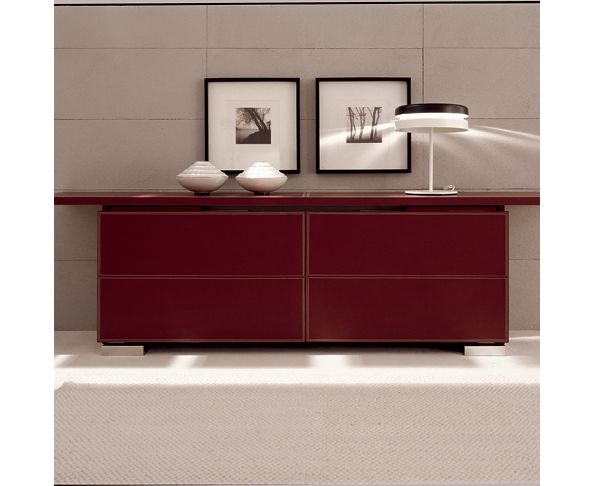 Комод с раздвижными дверцами, внутренним ящиком и полкой из прозрачного стекла. Столешница может быть длиннее чем основание. Топ, боковины и дверцы в отделке цвета орех Canaletto, венге, в глянцевом белом или черном лаке. Дверцы могут быть выполнены также из матового или зеркального стекла с алюминиевым обрамлением. Топ, боковины и дверцы также могут быть обиты кожей. Ножки из глянцевой нержавеющей стали.