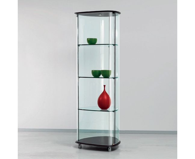 Витрина из прозрачного стекла. Верхний и нижний топ обиты кожей. С галогенной подсветкой. Максимальная нагрузка на одну полку 10 кг.