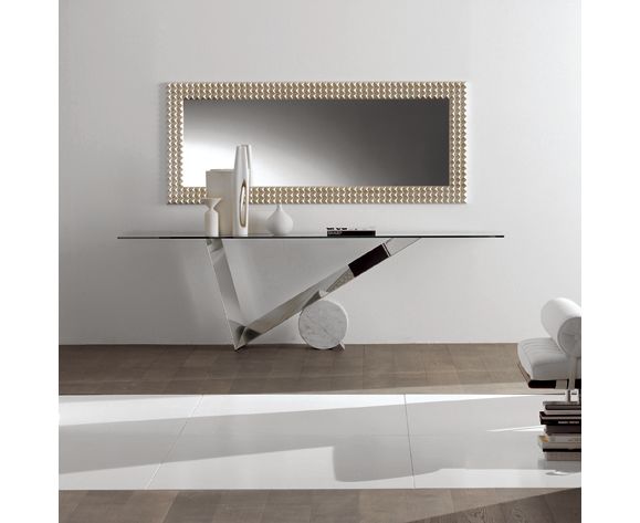 Консоль VALENTINOX Emanuele Zenere фабрики Cattelan Italia с основанием из глянцевой нержавеющей стали. Цилиндр из Травертина, белого мрамора Carrara или черного мрамора Marquinia. Столешница из прозрачного стекла 12 мм лежит на основе. Небольшие неровности отражающей поверхности основания связаны с ручной обработки.