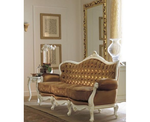 Именно резьба в стиле борокко характеризует представленную коллекцию с ее мягкими формами и плавными линиями. Это особая привелегия жить в гармоничном месте, где цвет дерева соединен с черным лаком, чтобы создать уникальное пространство. Трехместный диван CAVIO Benedetta BN8823 выполнен на каркасе из окрашенного массива древесины. Высокая фигурная мягкая спинка с декоративной стежкой - капитоне украшена фигурной рамой с резным элементом по центру. Красивые аккуратные подлокотники - завитки слегка расходятся в сторону. Диван предлагается в текстильной обивке. Мягкие подушки сиденья не закреплены на каркасе. Модель стоит на восьми фигурных ножках: четыре спереди и четыре сзади. Каркас украшен резными элементами ручной работы в отделке: белый, черешня Ciliegio Barocco и Ciliegio Barocco Nero, черный состаренный Nero anticato.