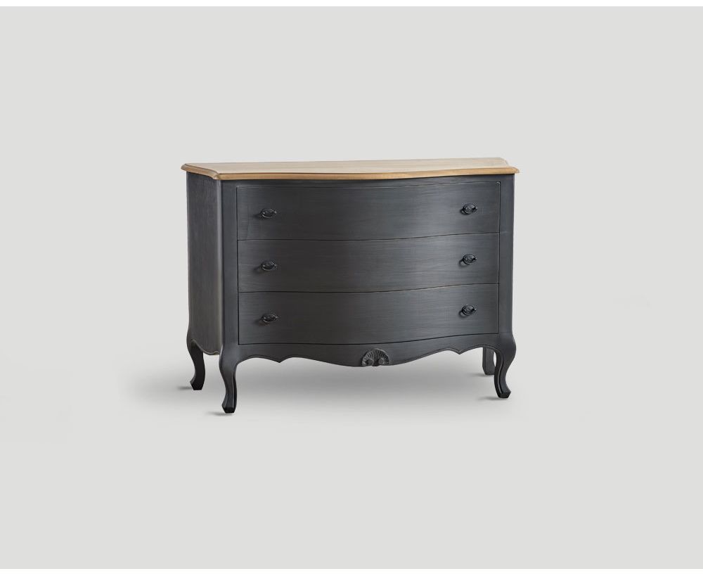 Comò 3 cassetti, in legno finitura laccata e cerata a pennello color Lavagna, top in rovere finitura Vintage Chiaro