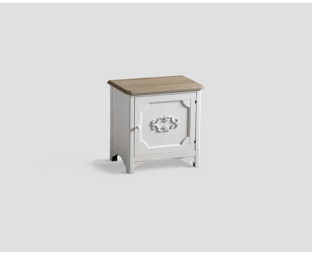 Comodino 1 anta, in legno finitura laccato bianco vissuto, top in rovere finitura vintage chiaro