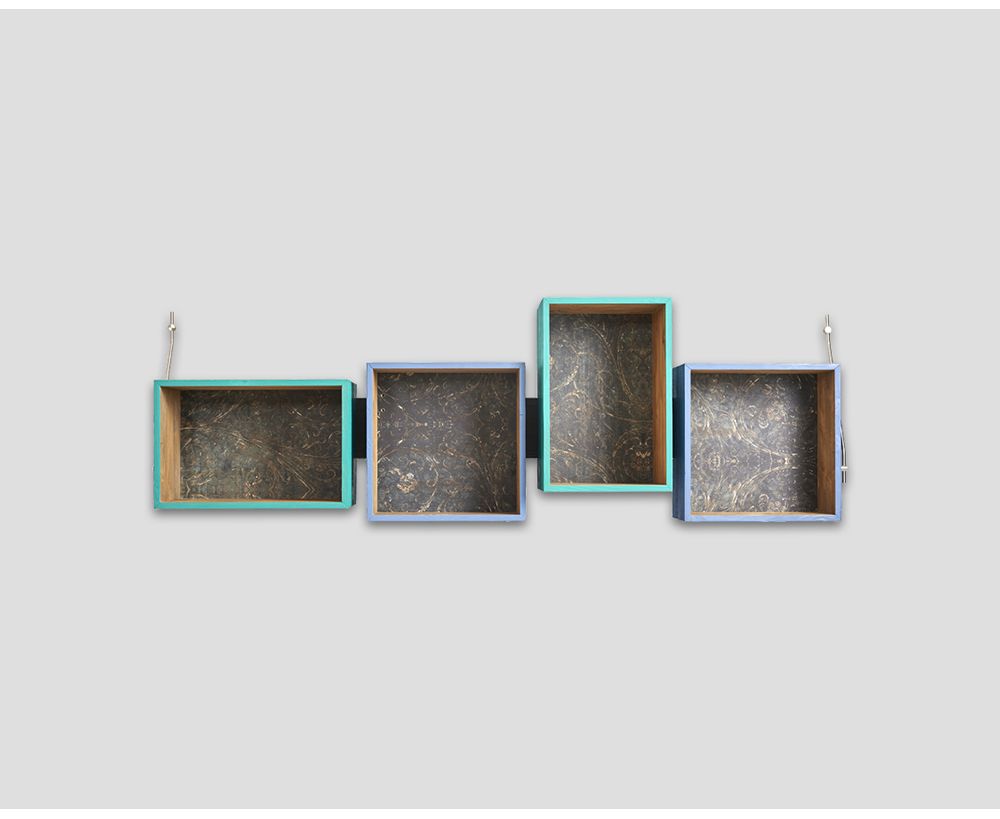 Consolle sospesa in legno vecchio riciclato laccata e cerata a pennello color blu avion e verde smeraldo, schienale stampato.