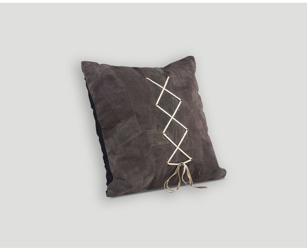 Cuscino con lacci lavorato a patchwork, in pelle riciclata color grigio scuro
