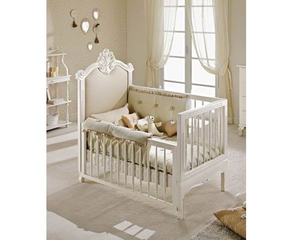 Детская кроватка, выполненная из массива древесины. Каркас украшен резными элементами ручной работы. Мягкое текстильное изголовье. Высоту расположения боковин можно менять.