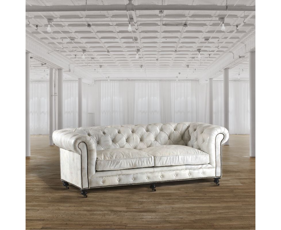 Двухместный диван на деревянном каркасе, обивка кожа. Невысокая спинка, подлокотники завитки украшены стежкой капитоне. Ножки на колесиках. Модель также декорирована мебельными кнопками.