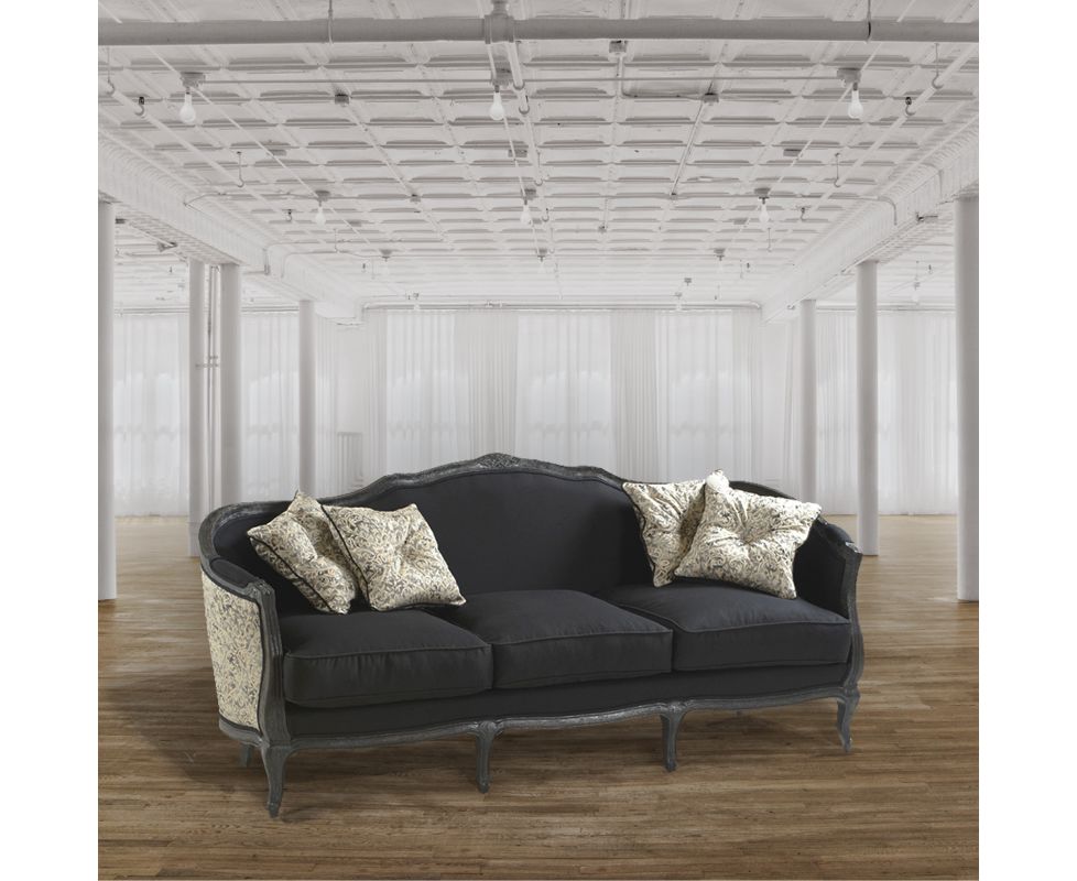 Трехместный диван на деревянном каркасе, выполненный в классическом стиле. Невысокая фигурная спинка, закругляясь переходит в подлокотники. Модель стоит на ножках кабриоли. Каркас украшен резными элементами.