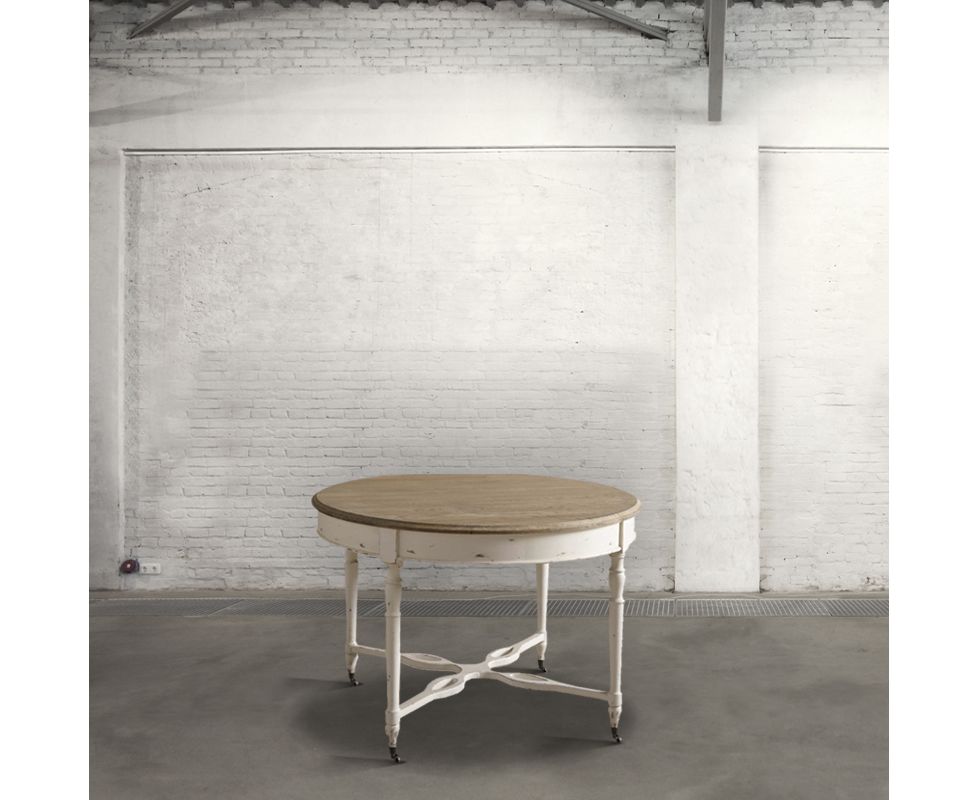Круглый обеденный стол из дуба на четырех ножках с колесиками.