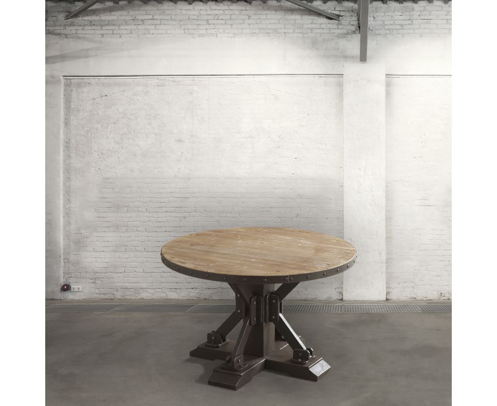 Круглый обеденный стол из дерева. Одна основная опорная ножка с крестообразной нижней частью.