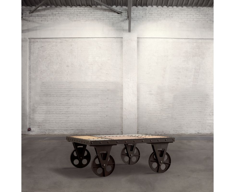 Журнальный столик из дерава с декоративными колесами вместо ножек.