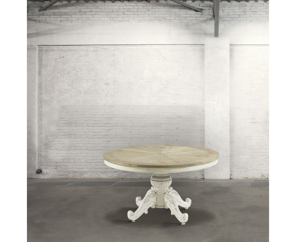 Круглый обеденный стол из дуба на одной опорной ножке с устойчивым основанием.