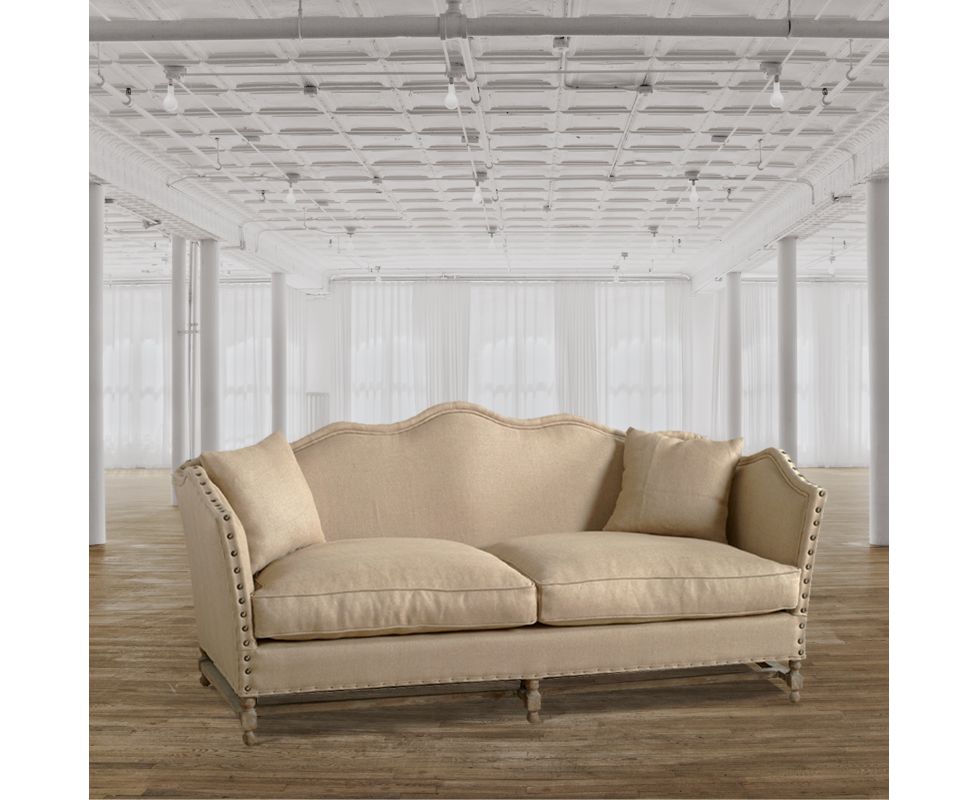 Двухместный диван на деревянном каркасе, выполненный в классическом стиле. Фигурная спинка и подлокотники. Подушки сиденья не закреплены на каркасе. Модель украшена мебельными гвоздиками. Фигурные резные ножки.