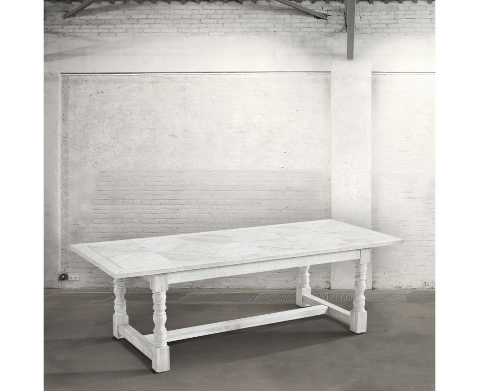 Прямоугольный обеденный стол из сосны на четырех опорных ножках.