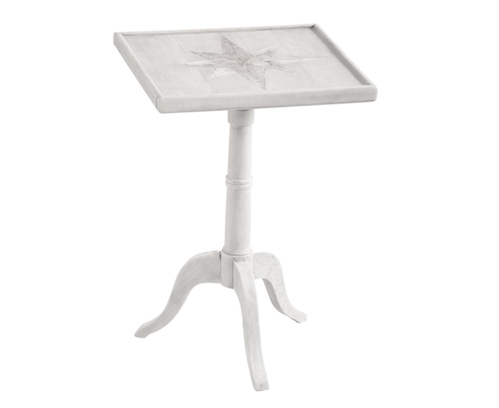 Маленький квадратный столик из сосны. Одна ножка с устойчивым основанием. Небольшие бортики по краю столешницы.