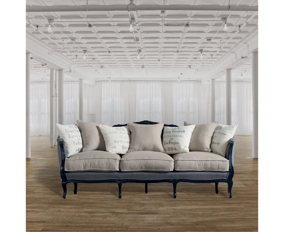 Трехместный диван на деревянном каркасе, выполненный в классическом стиле. Фигурная спинка и подлокотники. Стоит на ножках кабриоли. Подушки сиденья не закреплены на каркасе.