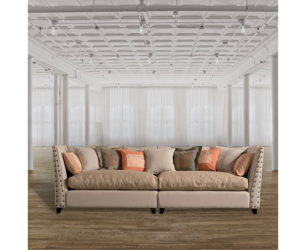 Двухместный диван на деревянном каркасе, выполненный в современной классическом стиле. Высокие подлокотники продолжают спинку. Модель украшена мебельными гвоздиками.
