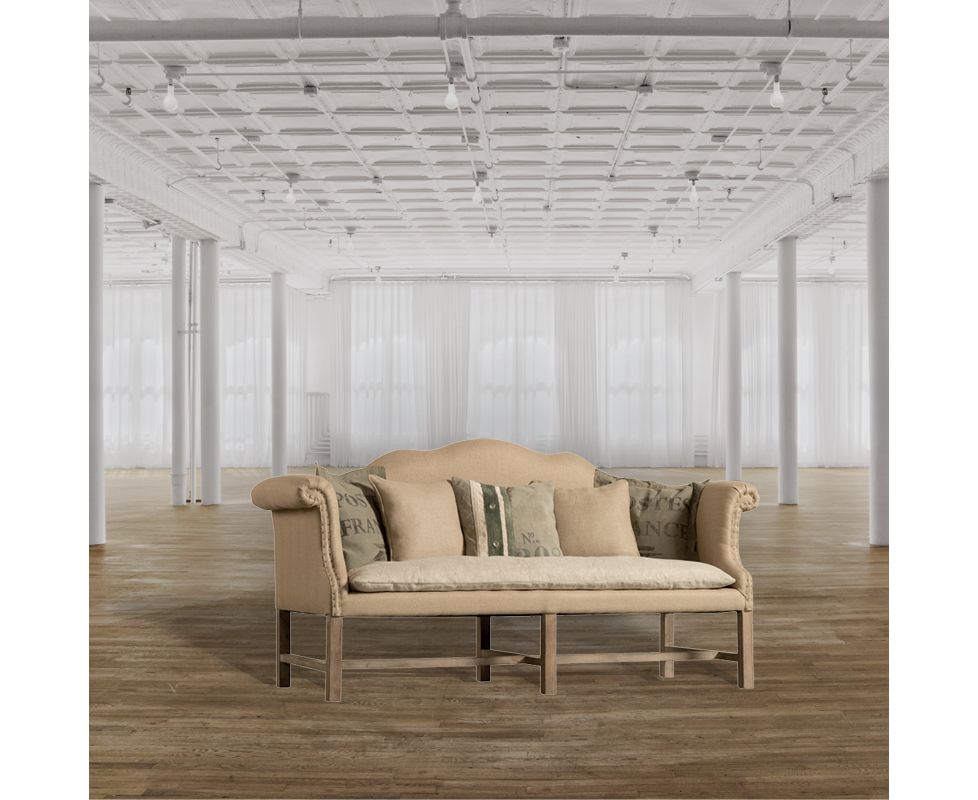 Двухместный диван на деревянном каркасе, выполненный в классическом стиле. Высокие подлокотники-завитки, фигурная спинка. Стоит на шести ножках.