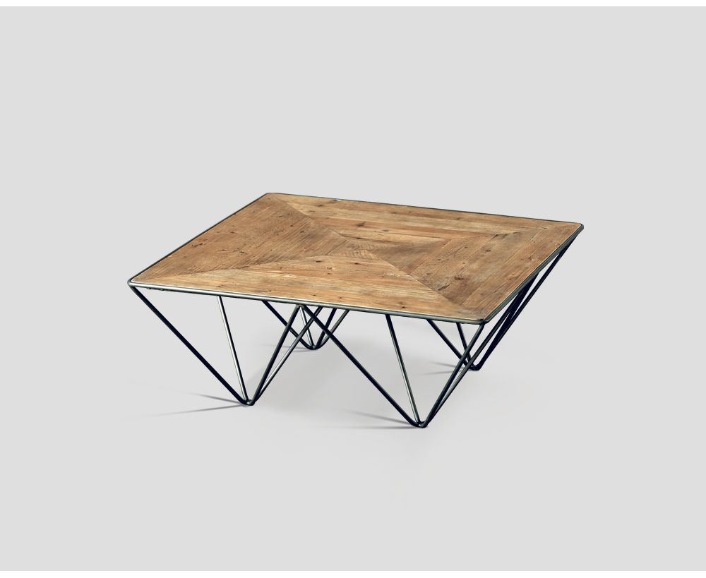 Tavolino quadrato con struttura in metallo finitura Ferro Brunito, top a quadrotta in legno vecchio ricilato finitura Naturale