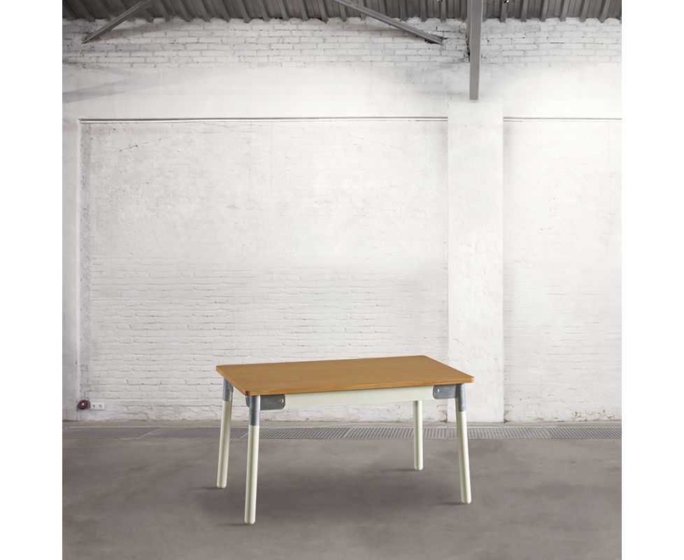 Прямоугольный обеденный стол из дерева на четырех ножках, укрепленных металлическими вставками.
