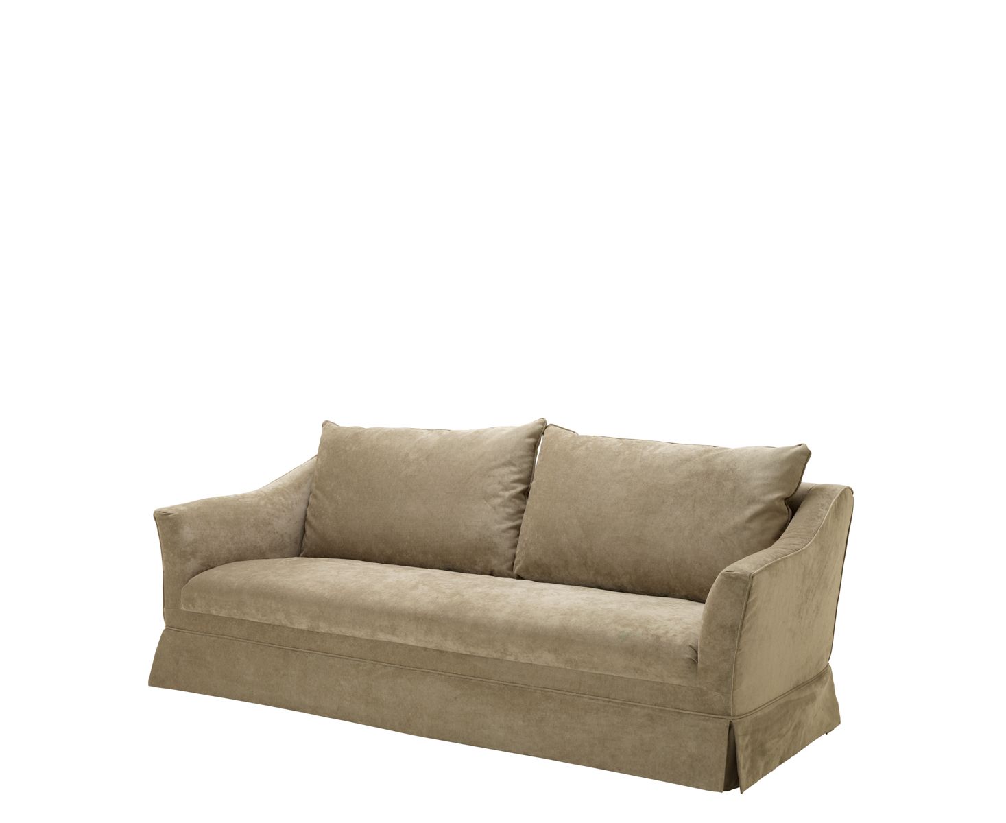 Красивый мягкий прямой диван для двоих. Невысокая спинка переходит в подлокотники с мягкими боковинами. Две свободные подушки спинки, мягкие и большие. Диван скромен, но это ни чуть не уменьшает его великолепия. Каркас полностью обит текстилем, ножки скрыты за декоративной юбкой.