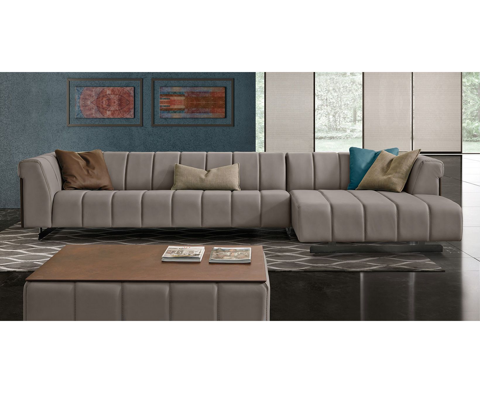 Персонализируемый модульный диван обрамлен остовом, обшитым кожей, который контрастирует с подушками в оригинальных расцветках. Также Nautilus отличается от других диванов благодаря нотке элегантности: его ножки покрыты металлическими пластинами в разных вариантах отделки.
