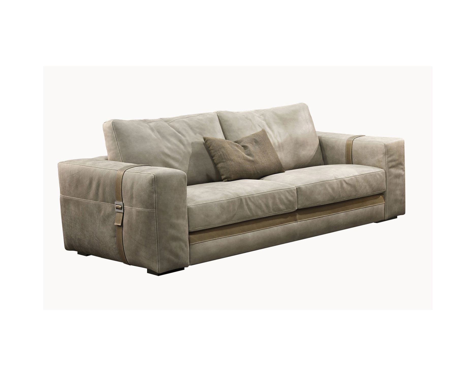 Кожаный диван в утонченном стиле, оснащенный изысканными кожаными ремешками, которые перекликаются по цвету с обивкой.