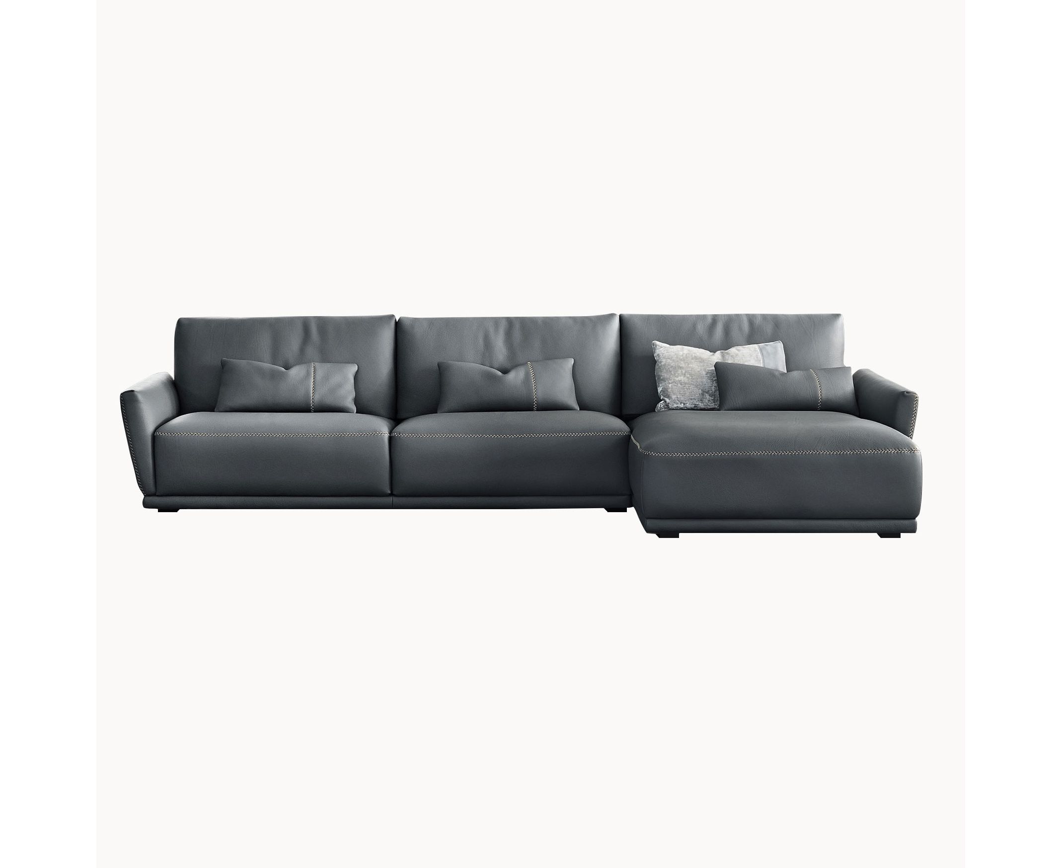 Кожаный диван с наклонными подлокотниками, может быть персонализирован и отличается особым швом, подчеркивающим изысканность и элегантность его форм.