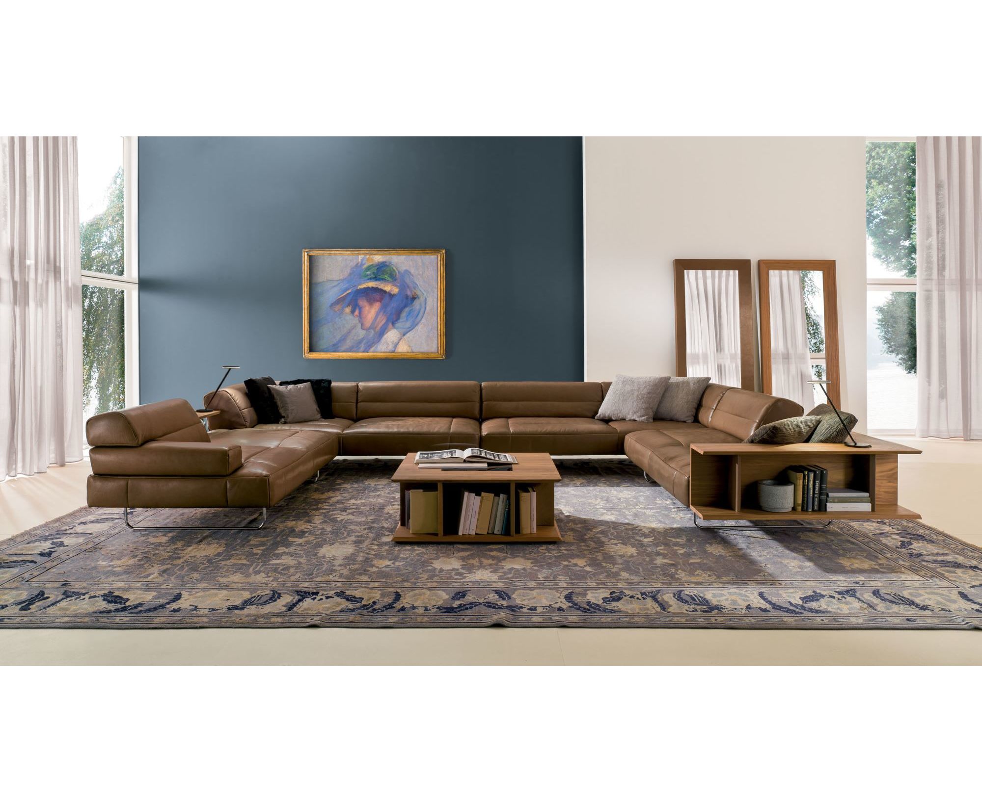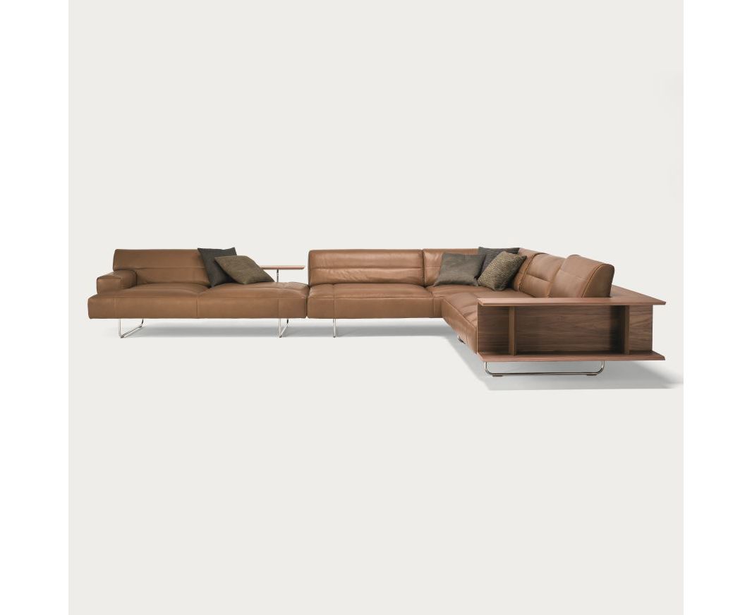 Обивка подушек, подлокотников и спинок выполнена из кожи с необработанным видимым швом, что подчеркивает плавные и мягкие формы. Полочки и тумбочки с ящичками линейные или угловые, из черного ореха с матовой отделкой и разделительными панелями, обитыми шорно-седельной кожей, прекрасно соединены с каркасом дивана, придают всему гармонию и динамизм. В результате получился современный, стильный и узнаваемый продукт, способный создать диалог с пространством, в котором он находится, где он уже больше не аксессуар, а точка средоточия, где можно проводить время в момент релаксации или совместного праздника.