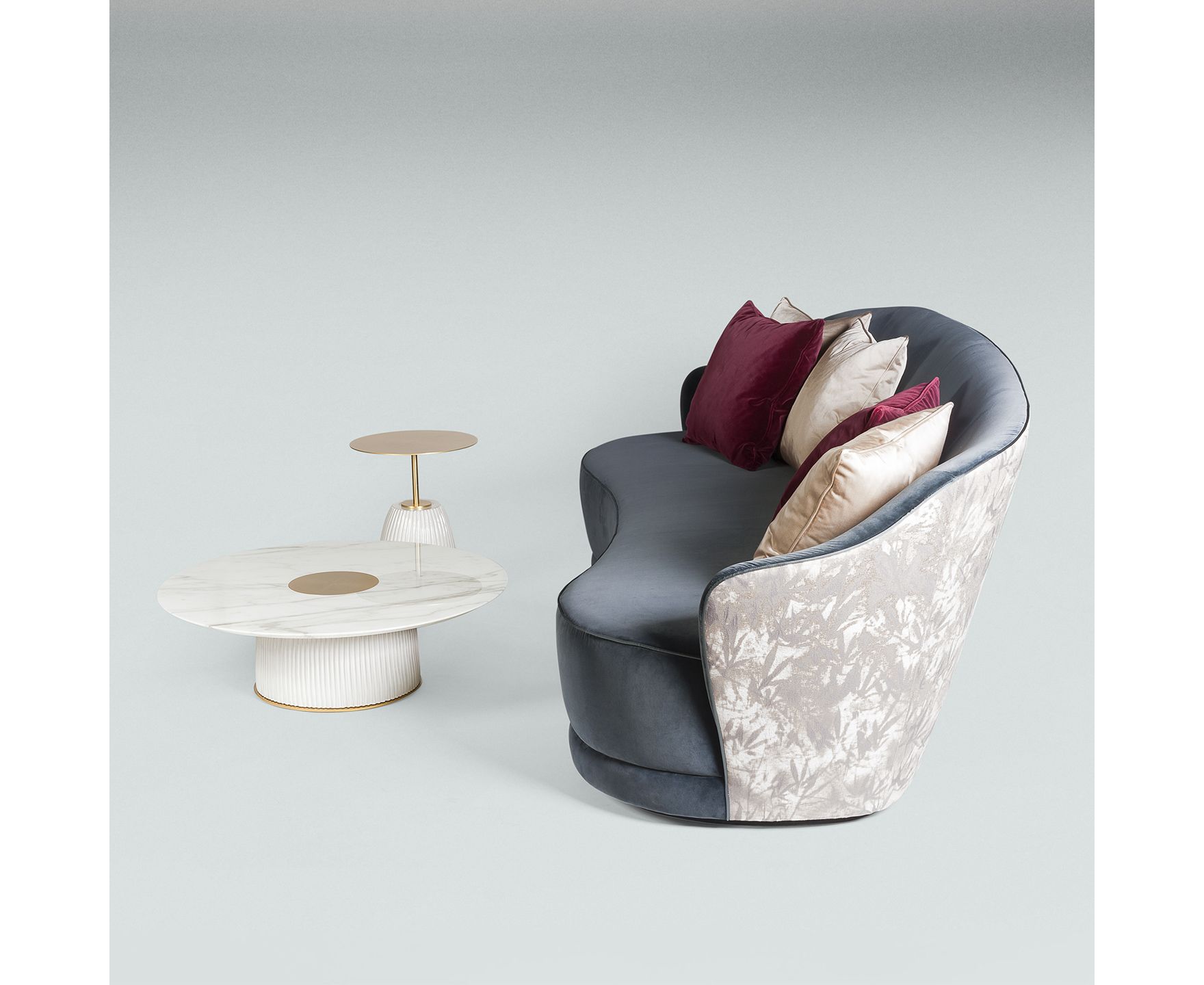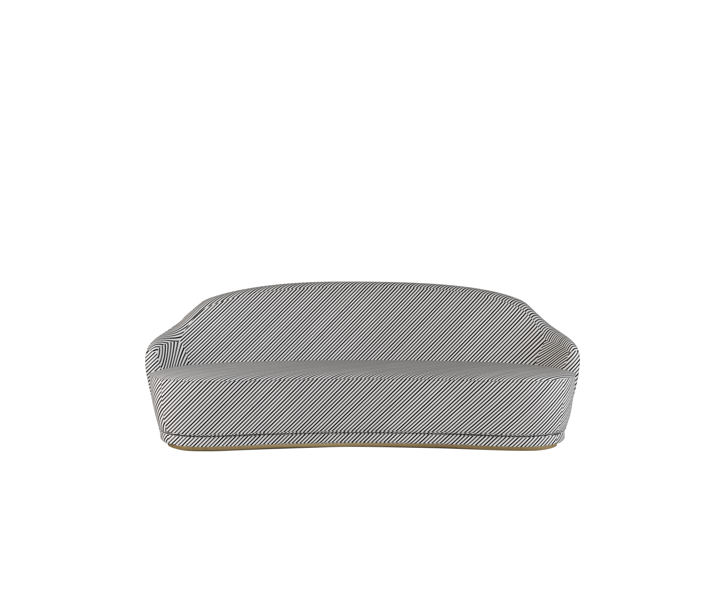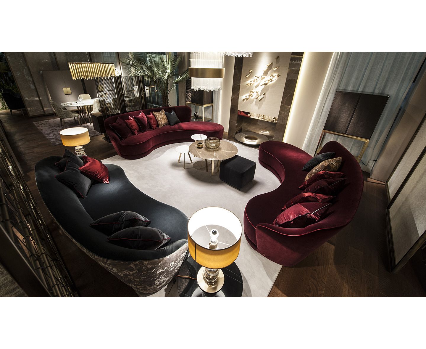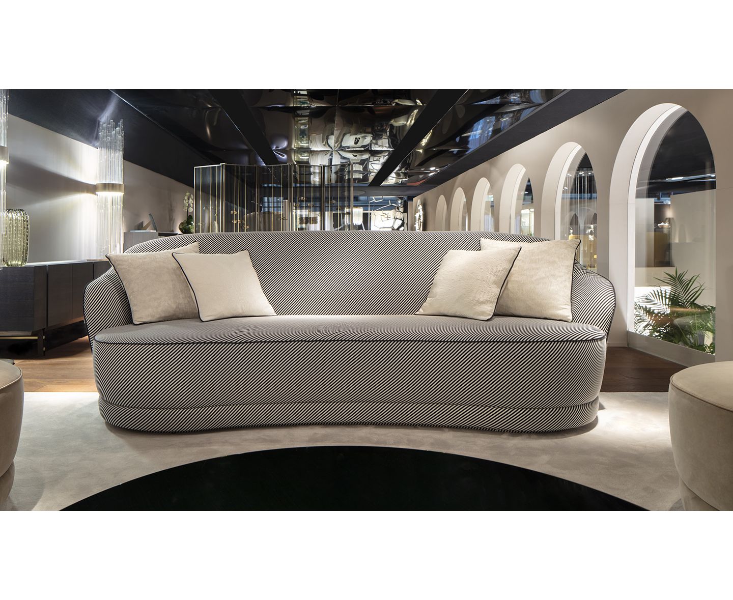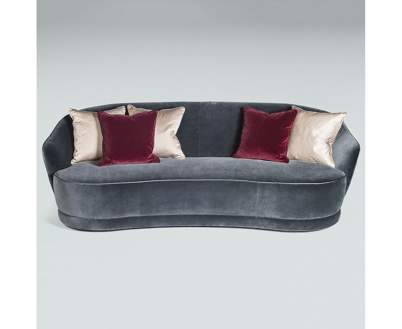 Трехместный вариант имеет симметричную форму и идеально подходит для разговоров как в общественных, так и в частных жилых помещениях, способен создавать динамичный и необычный эффект. Его деревянная структура имеет подвесную систему из эластичных лент с наполнителем из полиуретана разной плотности. Его основа изготовлена из дерева, покрытого теми же материалами. Несъемный чехол можно персонализировать с помощью мягкой бархатной ткани и декоративных подушек. Спинка может быть обита контрастным цветом даже с декоративными тканями. Обивка сделана с подходящим кантом, который украшает и увеличивает линию дивана.