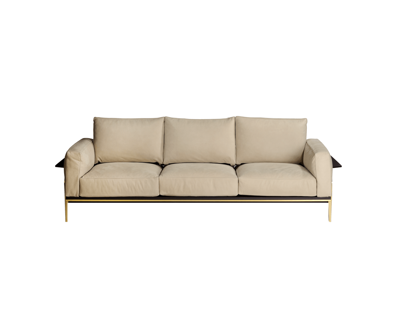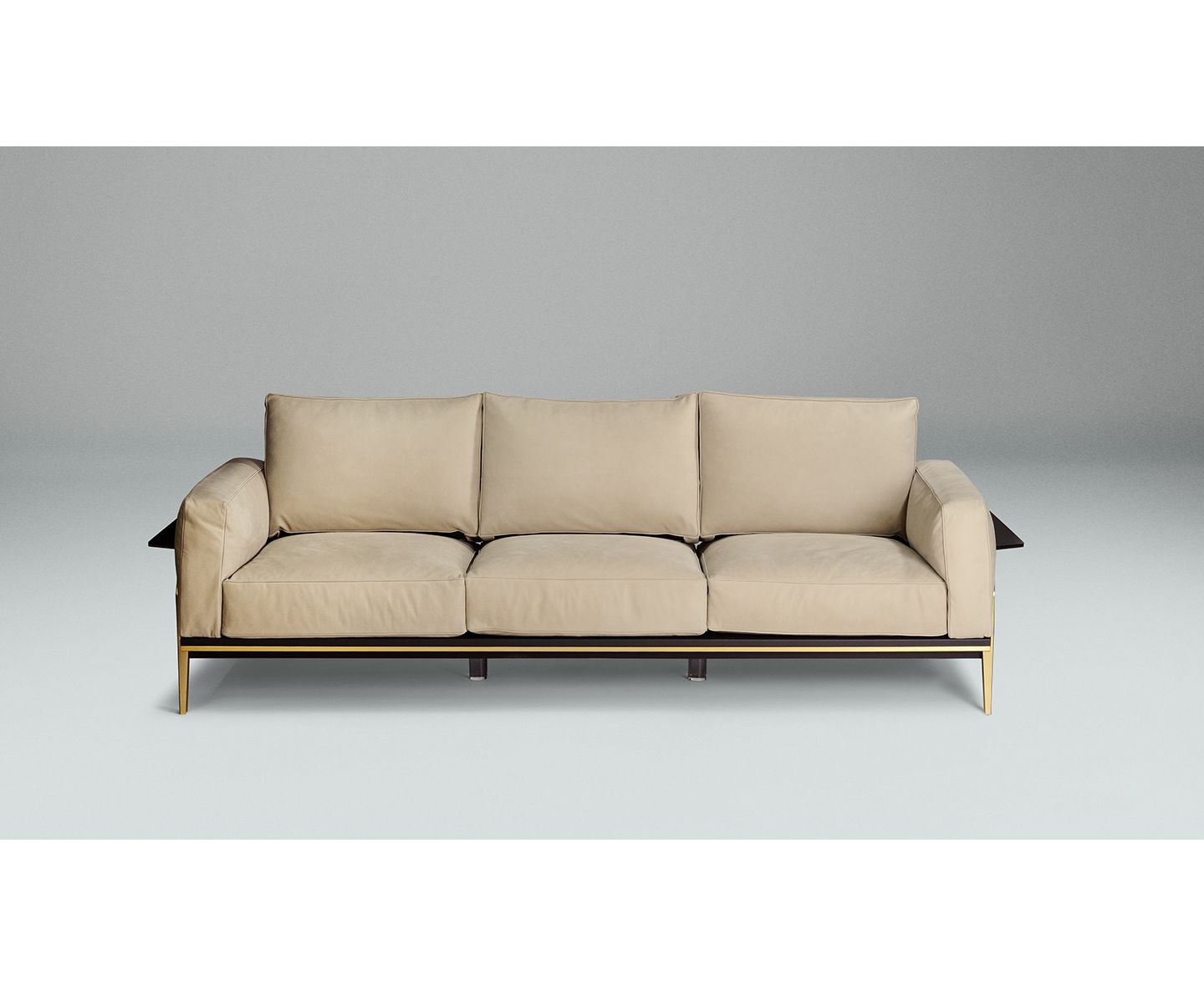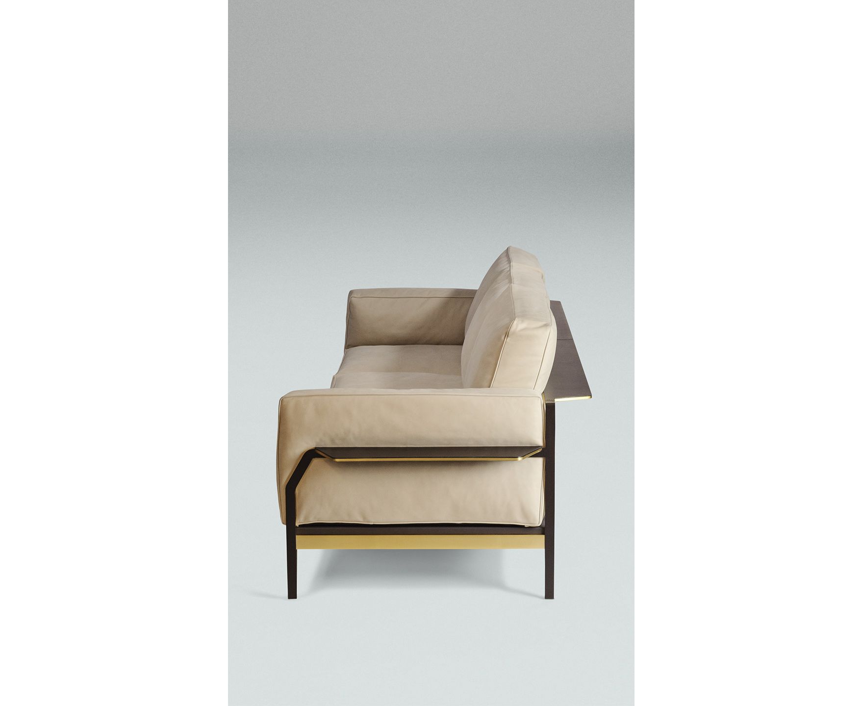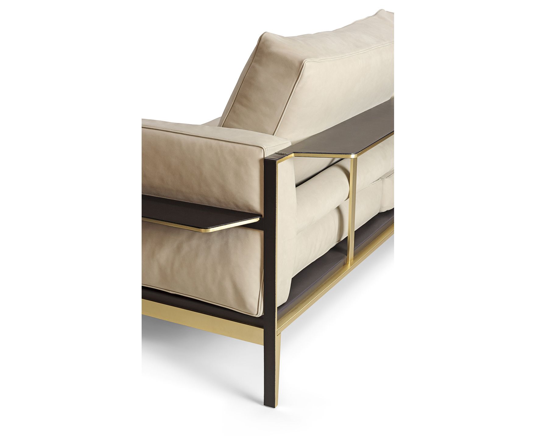 Victor Sofa имеет прочную конструкцию из металла, обогащенного гальваническим покрытием из матового золота, и драгоценные детали из темно-коричневой кожи в сочетании с мягкими и уютными трехместными подушками с кантом того же цвета, с перьями. По бокам и сзади находится плоскость, обитую темно-коричневой кожей, так что на нее можно ставить книги и другие мелочи. Диван доступен в тонкой коже и изысканной ткани. Съемное покрытие для подушки сиденья и спинки.