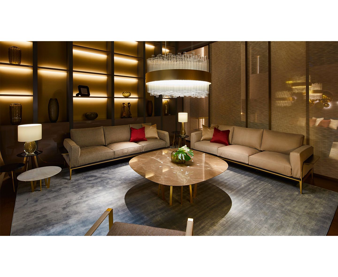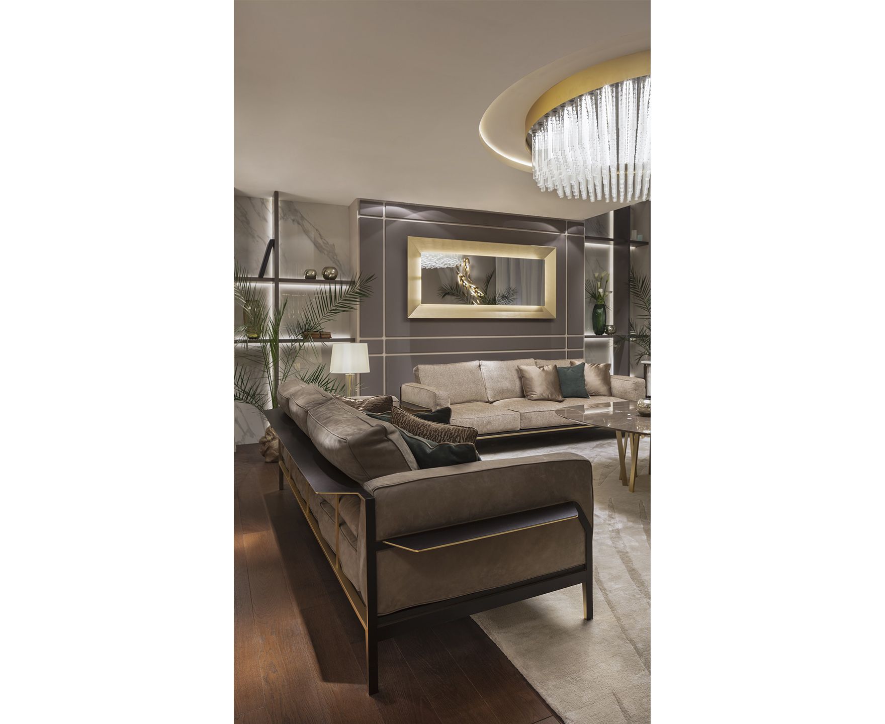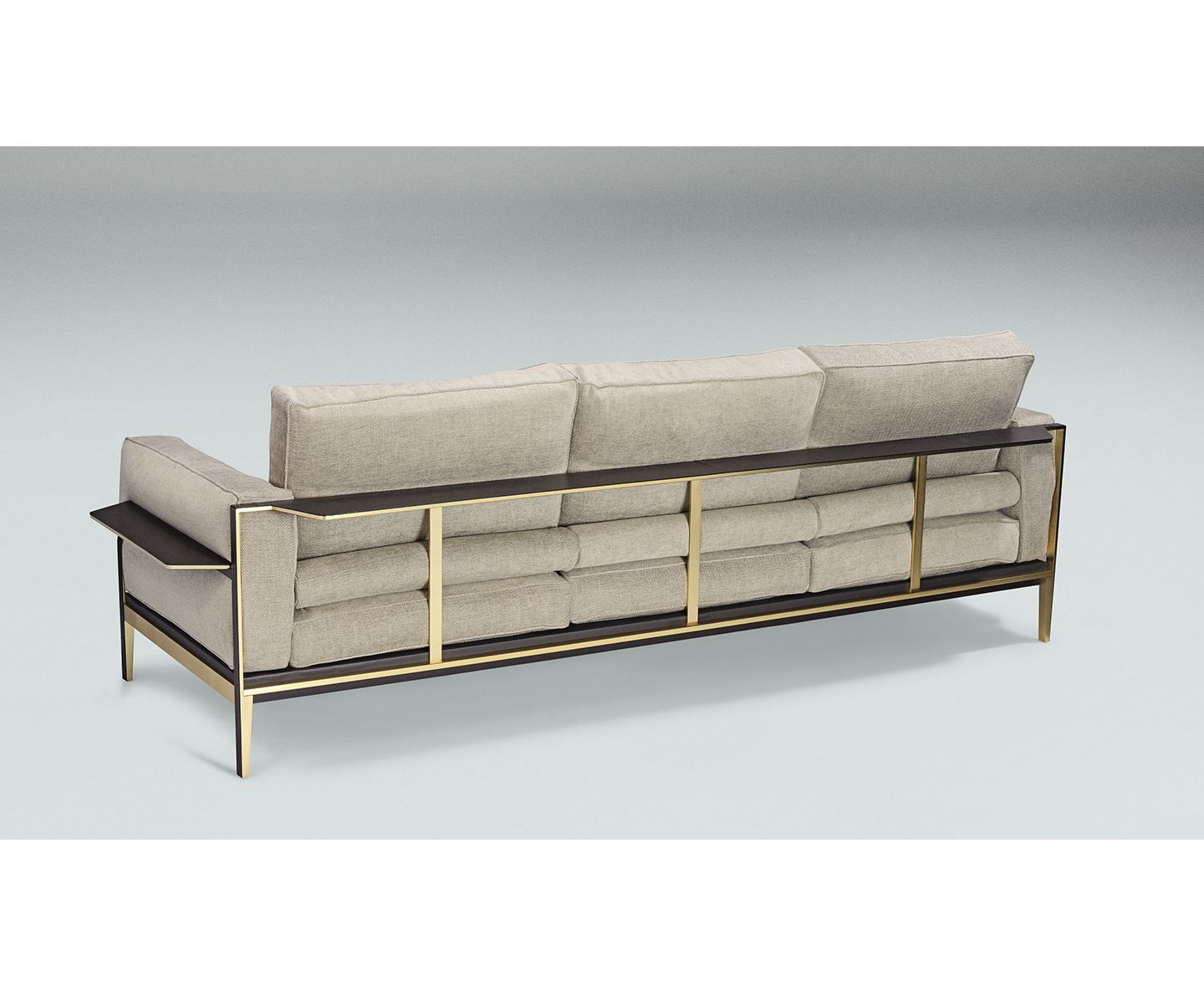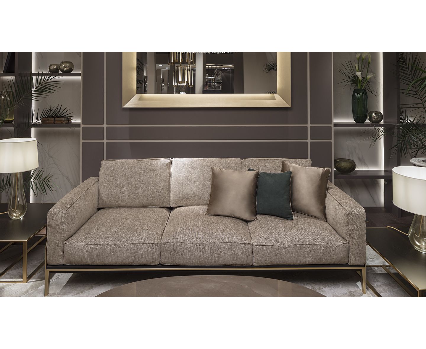 Victor Sofa имеет прочную конструкцию из металла, обогащенного гальваническим покрытием из матового золота, и драгоценные детали из темно-коричневой кожи в сочетании с мягкими и уютными трехместными подушками с кантом того же цвета, с перьями. По бокам и сзади находится плоскость, обитую темно-коричневой кожей, так что на нее можно ставить книги и другие мелочи. Диван доступен в тонкой коже и изысканной ткани. Съемное покрытие для подушки сиденья и спинки.