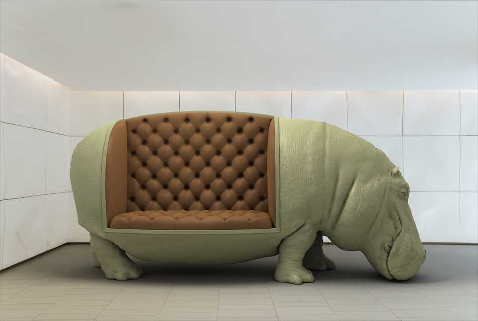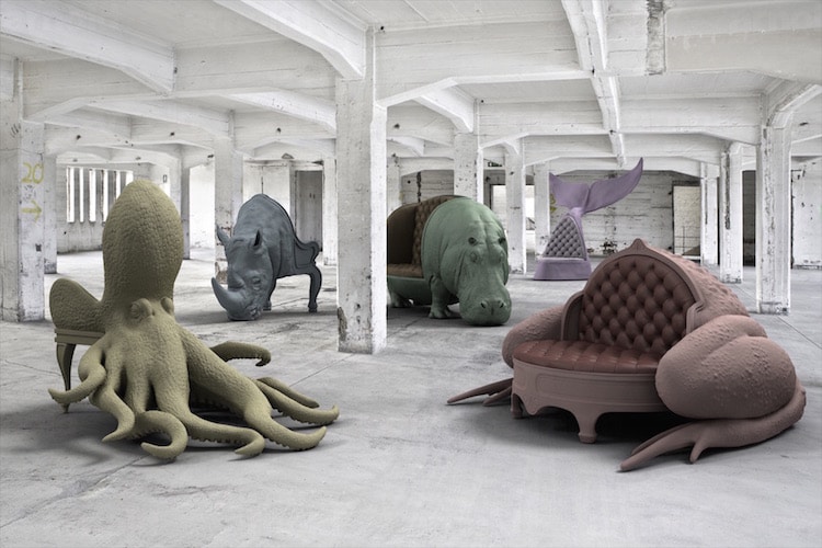 Коллекция испанского художника Maximo Riera Animal Chair Collection, пугающая по размерам и реалистичной визуализации, является данью уважения к царству животных нашей планеты, вылепленному из полиуретана и кожи из 3D-модели. Стулья изготавливаются на заказ и могут быть выполнены в виде гиппопотама, осьминога, носорога, слона, жабы, кита, буйвола и жука.