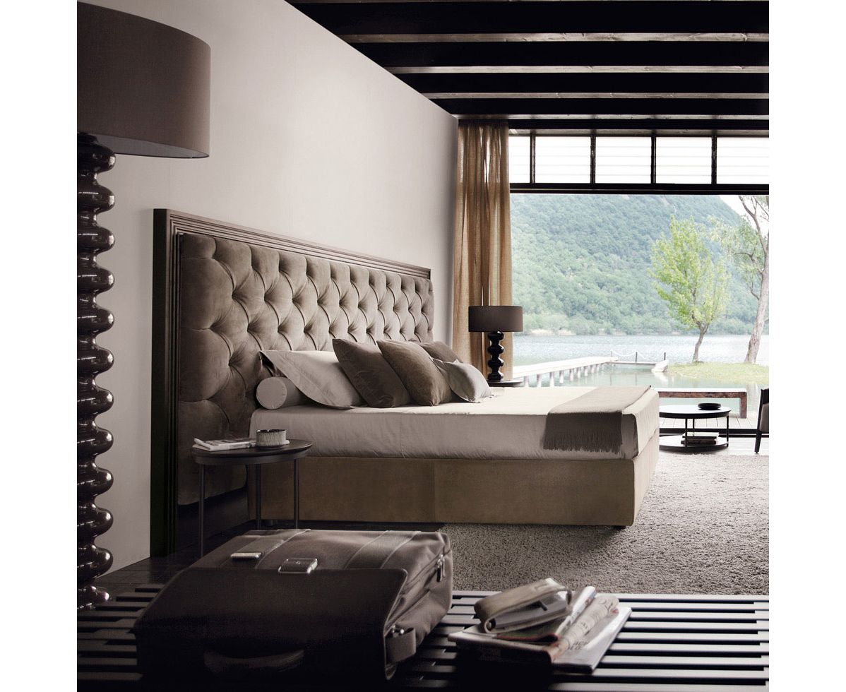 Шикарная современная двуспальная кровать с высоким и широким изголовьем, крепящемся к стене. Оно украшено стежкой капитоне. Доступны различные размеры, что делает выбор простым и приятным.