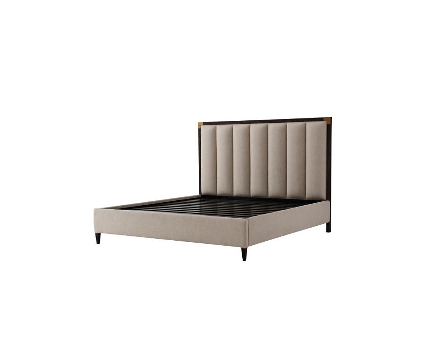 Рамка с анисовой отделкой и матовыми никелевыми углами. Мягкое изголовье с вертикальными бороздками. Изножье с коническими ножками.