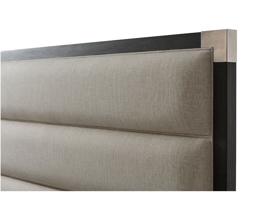Рамка с анисовой отделкой и матовыми никелевыми углами. Мягкое изголовье с горизонтальными бороздками. Изножье с коническими ножками.