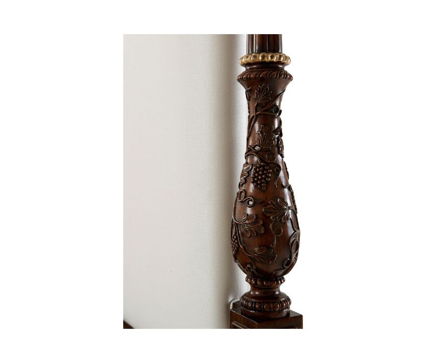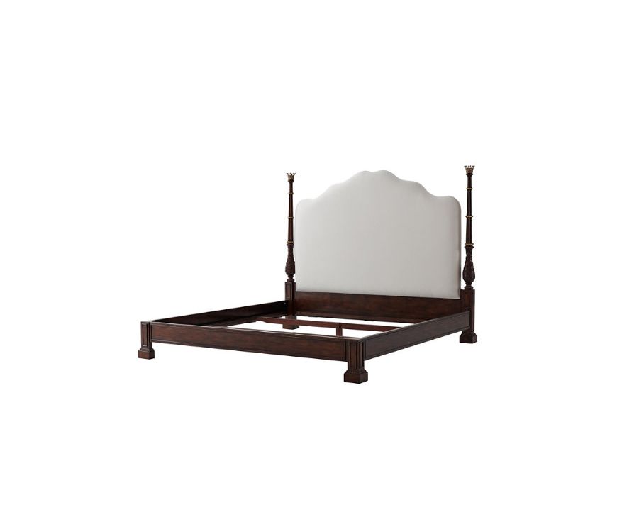 Прекрасная кровать из красного дерева, извилистое и арочное обитое изголовье, окруженное резными балясинами из лозы, образующими кластерные колонны с позолоченными деталями и увенчанное латунной короной из графа с обшитыми панелями перилами на ножках.