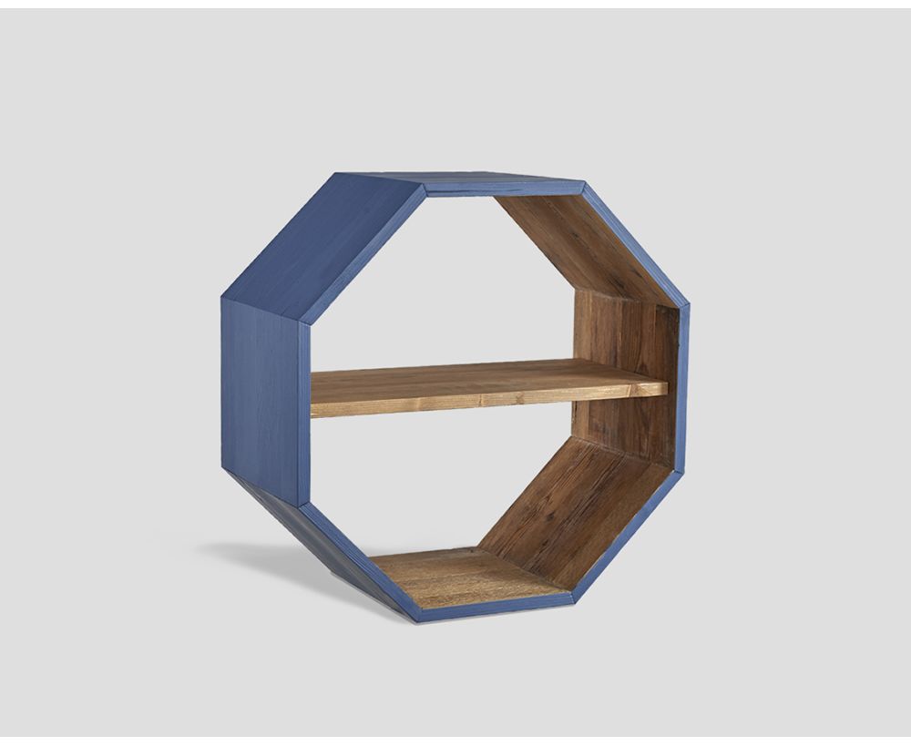 Elemento componibile ottagonale in legno vecchio riciclato, interni e ripiano in finitura naturale, esterno laccato e cerato a pennello disponibile nei seguenti 7 colori: Blu Avion, Verde Smeraldo, Lavagna, Bianco, Giallo, Rosso, Verde Bosco e old pine.