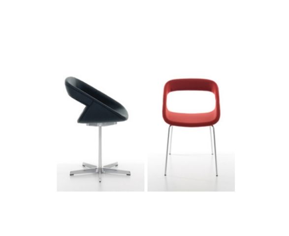 Стул из искривленного листа тонкой древесины, покрытого шпоном, лакированного или мягкого. Поворотная конструкция с 5 спицами из литого алюминия или 4 ножки из хромированного металла или твердых пород дерева.