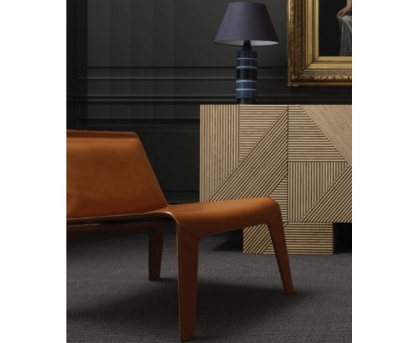 Низкий стул из изогнутой фанеры. Покрытие под цвет натурального, тонированного дуба или матового лака. Возможен вариант с покрытием полностью из твердой кожи.