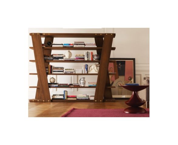Книжный стеллаж выполненный из дерева с Х-образными стояками. Украшен декоратиынми болтами из латуни. Доступны различные варианты отделки древесины.