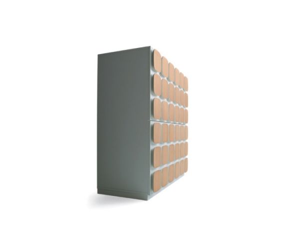 Шкаф в различных версиях и размерах. С дверцами или выдвижными ящиками. Фронтальные деревянные пано с лакированными ручками. Различные варианты внешней отделки.