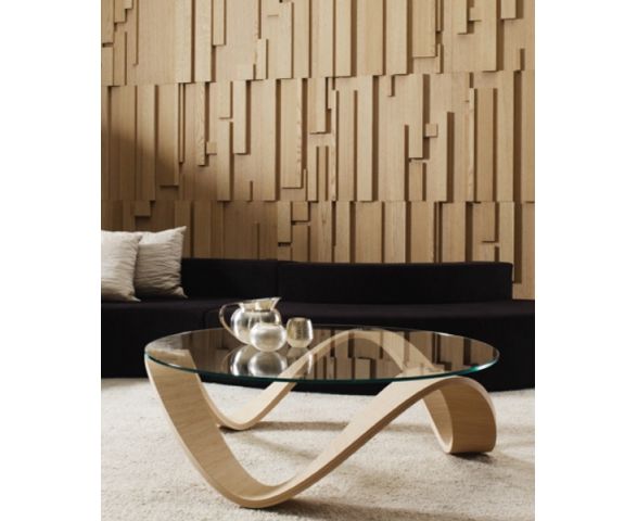 Круглый стол с основой в виде изогнутой деревянной полосы. Столешница из стекла или древесины. Доступны различные варианты обработки основы.