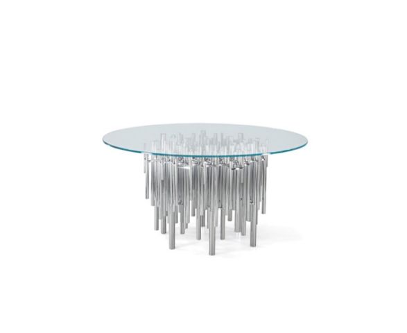 Эксклюзивный стол из аллюминия овальной или круглой формы. Столешница крепится на аллюминиевых трубках различной длины. Возможны варианты из анодированного аллюминия (подходит для уличного использования), хромированного, хромированного титана, с латунной отделкой. Столешница может быть изготовлена из прозрачного или дымчатого стекла.