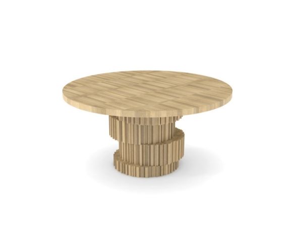 Столы различных размеров - круглые, квадратные или прямоугольные с основанием из элементов смещенных относительно оси симметрии, изготовленных из твердых дубовых планок на многослойной основе. Столешница выполнена из высококачественного дуба в виде мозаики из клиновидных вставок.