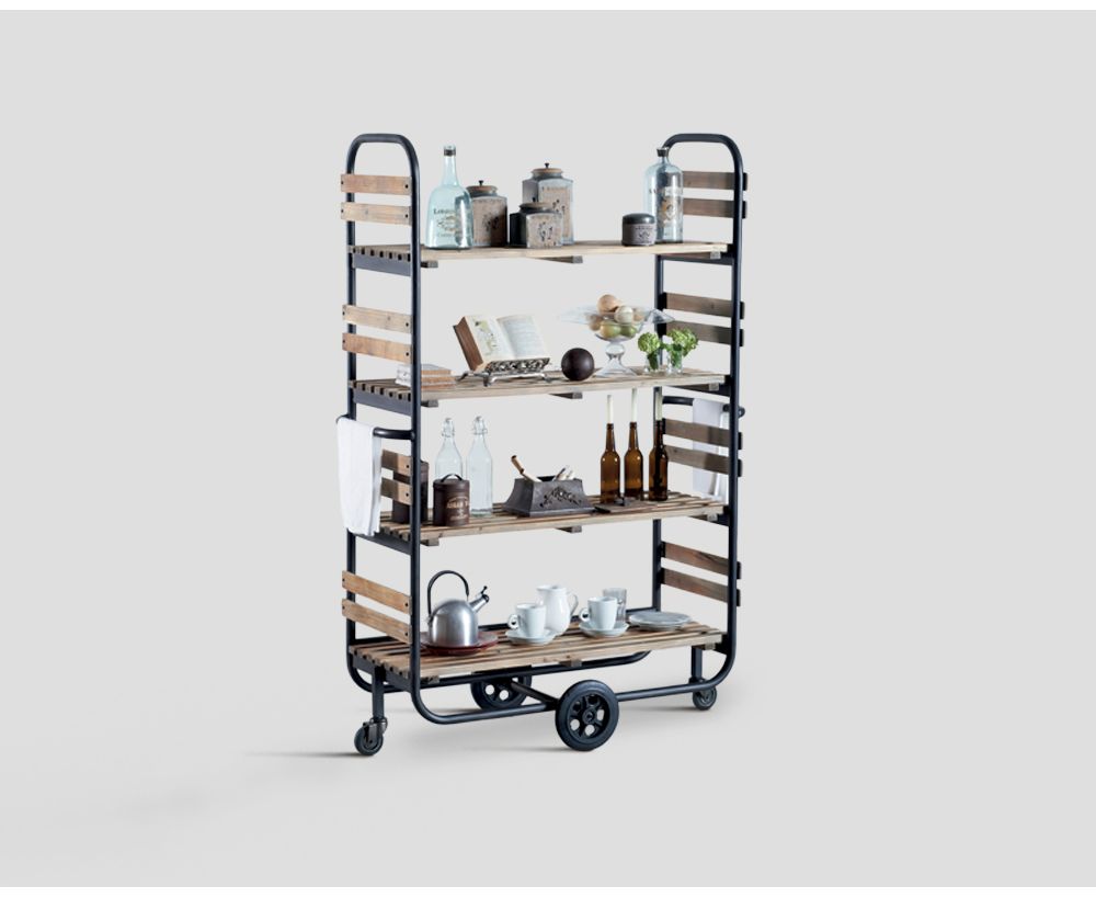 Etagère bifacciale con ruote, struttura in metallo finitura Ferro Brunito, piani in legno vecchio riciclato finitura Naturale