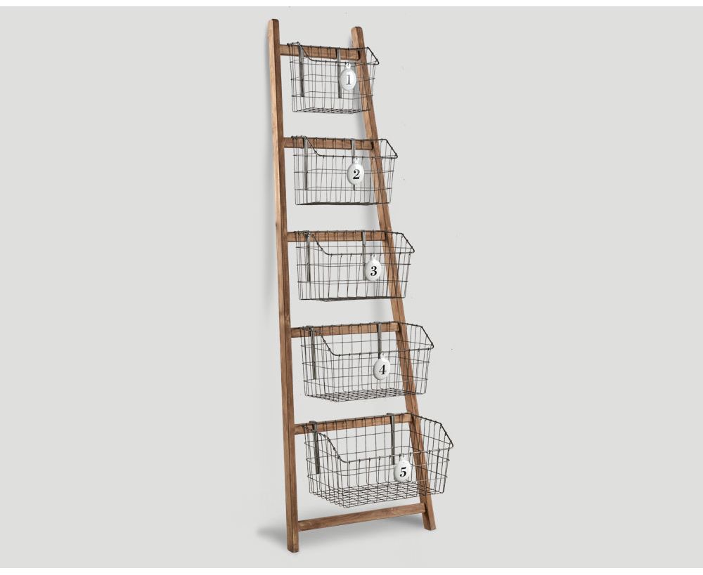 Etagere a scaletta in legno con 5 ceste in metallo Finitura Brunita